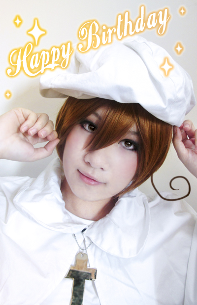 准时送上!啊敏生日快乐啊!(本来想找意大利文的生日快乐,谁知道。。就那么一个样读音不一样而已。靠= =。今天眼睛痛了一天。N年之后再次动手自己化妆,还贴睫毛。乱到死。还弄到衣服上了OTZ 呆毛拍照很难入镜,P上去好了。总之~生日快快乐乐!